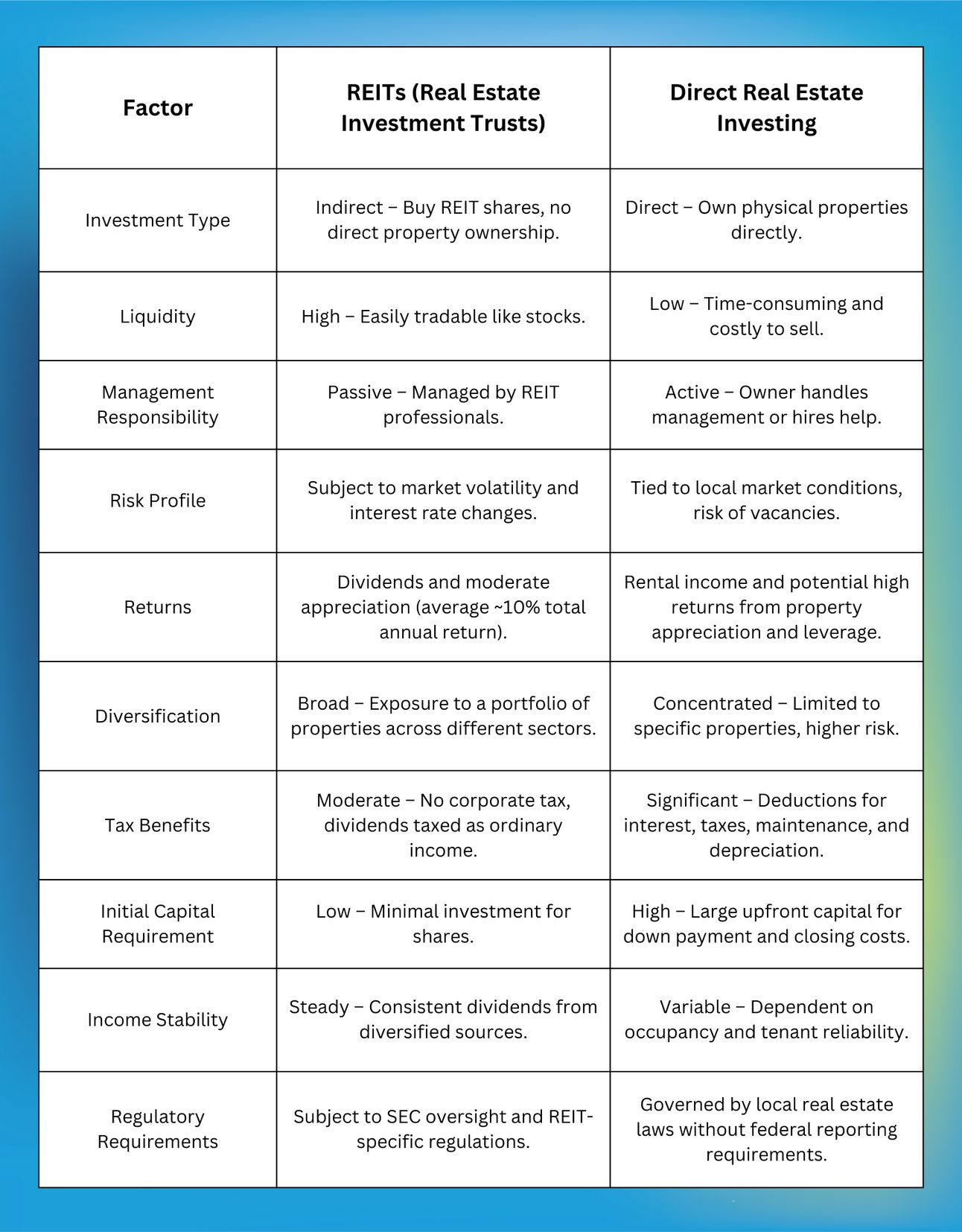 REITs vs. Direct Real Estate Investing Comparison Table
